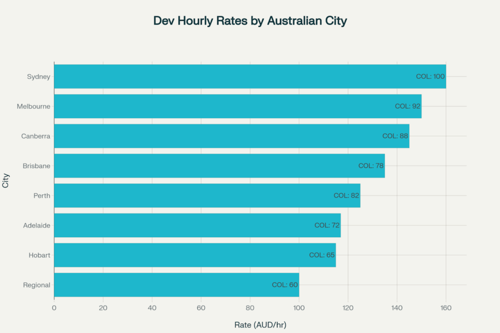 Strong English proficiency, cultural fit, regulatory knowledge, and high standards that lower miscommunication costs, rework, and project failures typical of purely offshore approaches are all reflected in Australian development rates (AUD 85–250/hour).