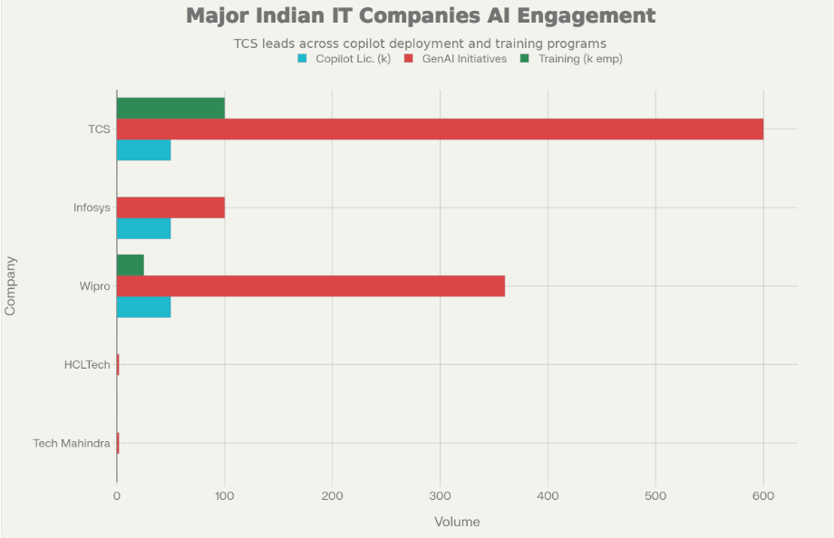 Leading Indian IT companies are making significant investments in AI adoption, with TCS, Infosys, and Wipro having deployed over 50,000 Microsoft Copilot licenses each and running hundreds of GenAI programs
