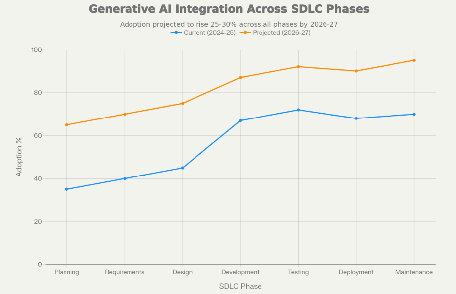The adoption of Generative AI in all phases of SDLC (Software Development Life Cycle) is growing rapidly. Development & Testing leads the current adoption at 67-72%