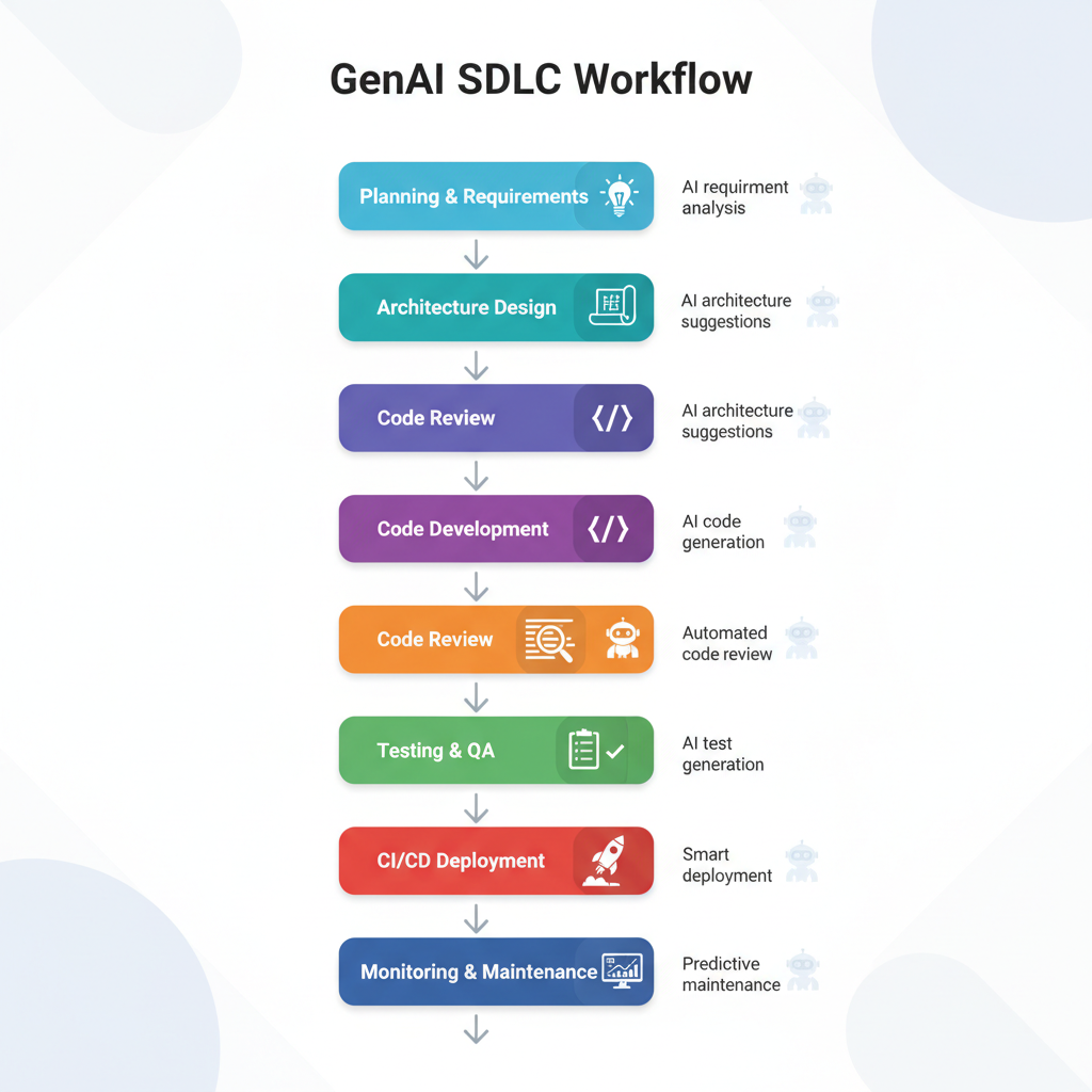Visual representation of Generative AI involvement at each of the 7 stages of the Software Development Lifecycle (SDLC)