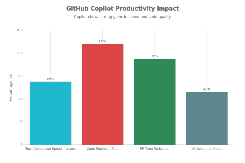 GitHub Copilot unlocks measurable productivity improvements across the board, with developers working 55% faster and keeping 88% of the lines of code generated by the AI.