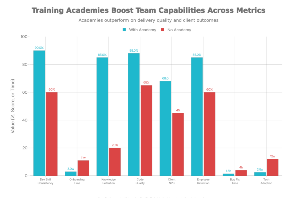 Academy companies can quickly train teams when a client needs a new feature (we need a mobile app version, we need real-time analytics, we need AI-powered features). Non-academy companies have to be filled through expensive hiring or outsourcing. This agility is appreciated by clients.