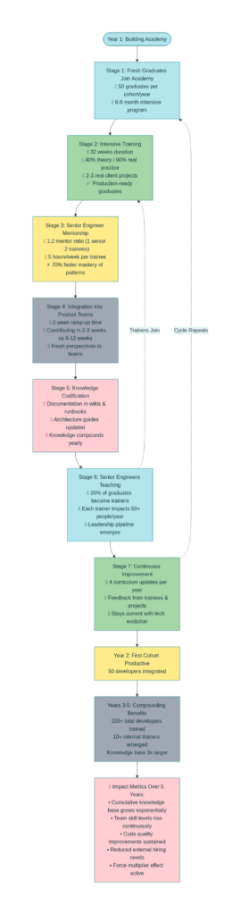 Year 2, your first 50 graduates move into product teams. Now you can staff projects with your own people rather than bringing in costly outside talent. Their ramp-up is weeks, not months. They already know the architecture because they have built real projects with your systems.