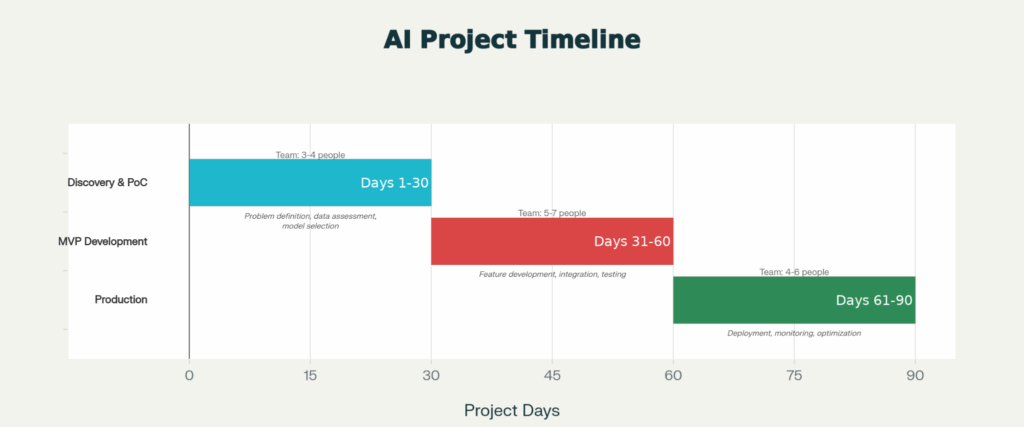 Deliverables by day 90: System running in production, monitoring dashboard, optimization documentation, handoff to operations team, and support procedures in place.