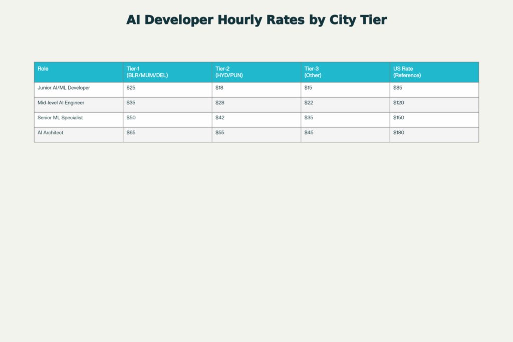Mid-level AI engineers (2-5 years experience) are charged at $20-$35 per hour in Tier-1 cities (Bangalore, Mumbai, Delhi) and $15-$25 per hour in Tier-2 cities (Hyderabad, Pune).