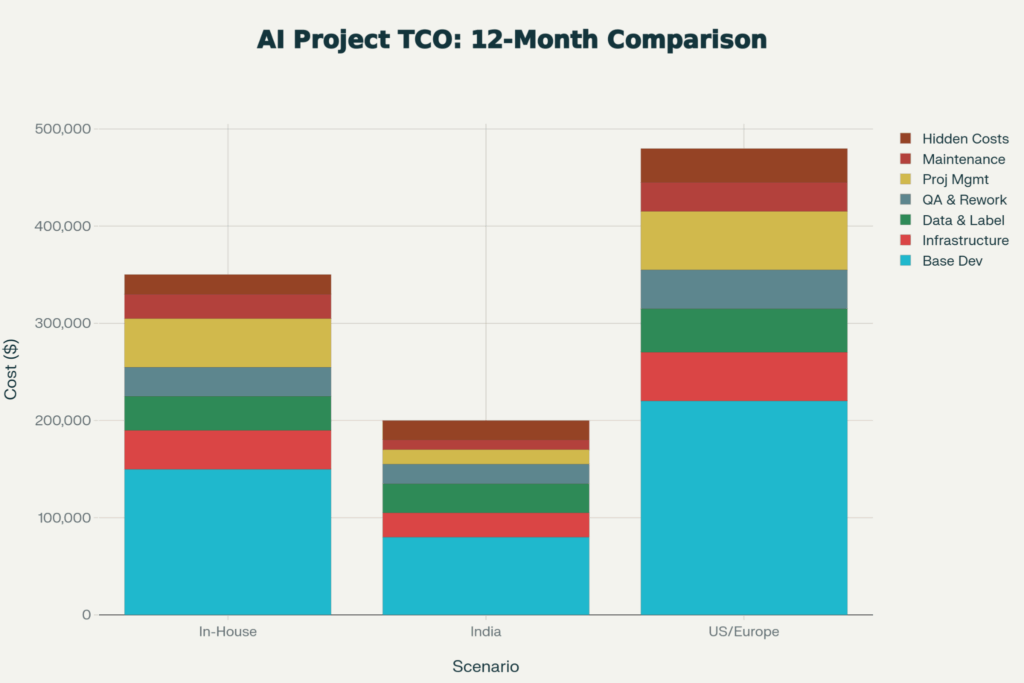 Most companies rate the headline cost and then forget about any hidden costs, which actually determine if the project is viable. A mid-level AI engineer in India might charge $20-$30 an hour, which is far cheaper compared to $80-120 an hour in the US. The headline rate doesn’t reveal the full story.
