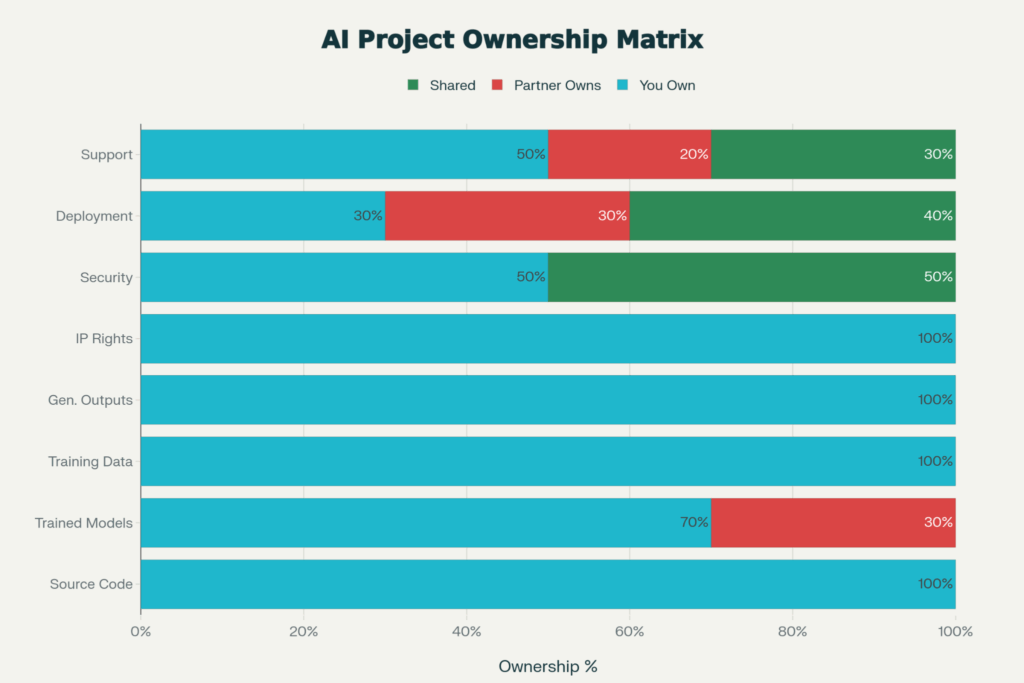 Essential contract language to ensure: “All custom work product produced by Vendor for Client shall be owned by Client as work made for hire.” The client acquires all intellectual property created by the vendor during the engagement. The vendor warrants that none of its work infringes on third-party IP and that all training data is properly licensed.