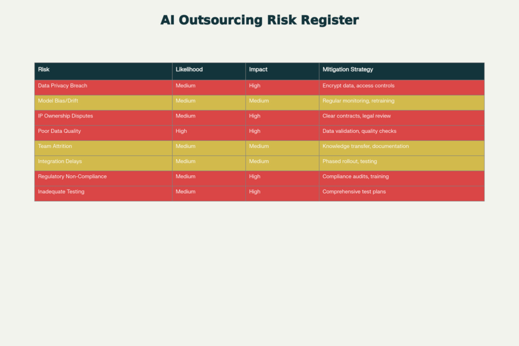 Disputes over IP ownership (high impact, medium likelihood). Craft explicit contract language dictating that all IP rights in any work product through the contract are assigned to you, individualized developer IP assignments, custom work documentation, and audit rights.