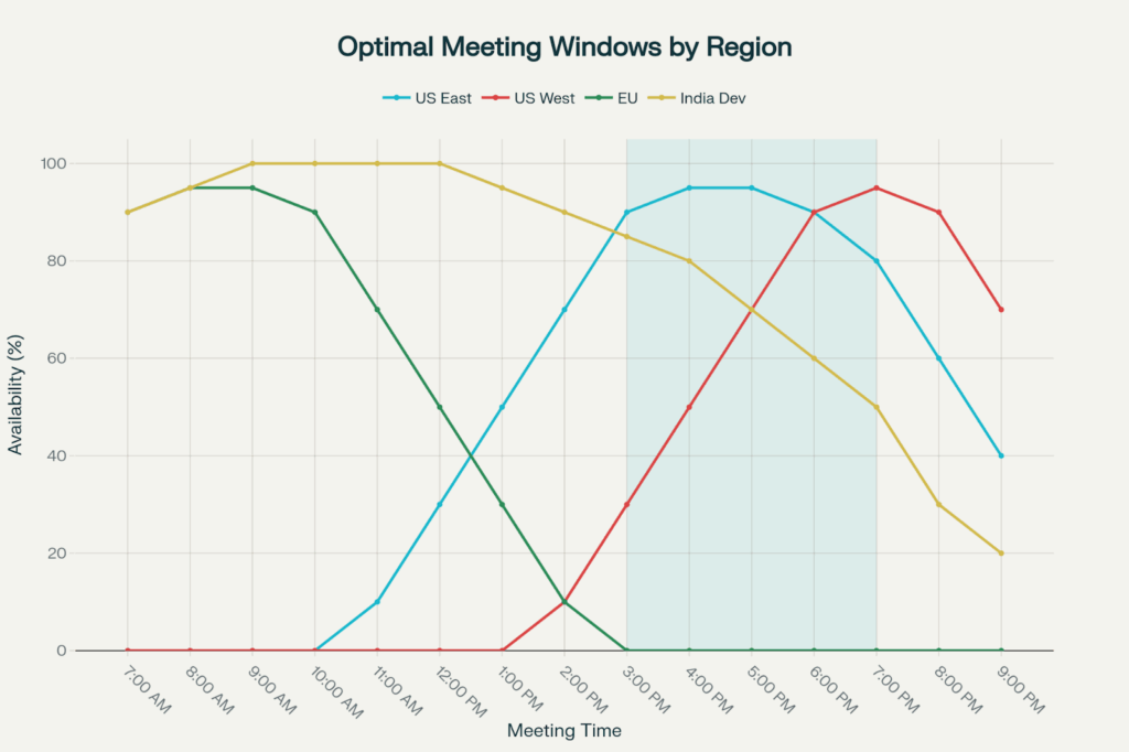 The scheduling optimality of peak overlap time is that activities of the highest value with the greatest need for interactivity are scheduled during peak overlap times. For the teams on the US East Coast + India team: 3-6 PM IST (5:30-9 AM EST) is the best timing that Indian developers can work comfortably in the early morning, and US teams could meet late at night. Schedule sprint planning, architecture discussions, and critical stakeholder meetings for this window.