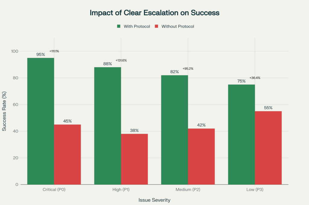This dramatic contrast demonstrates solid escalation procedures that more than double success rates for critical issues, from 45% to 95% for P0 incidents