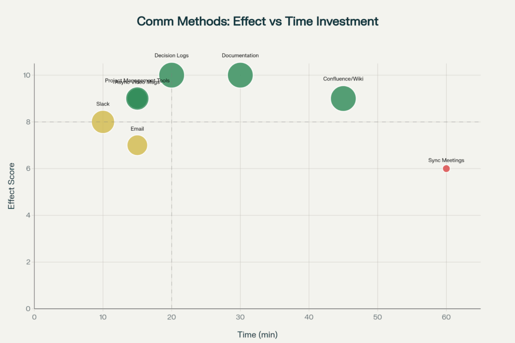 This scatterplot determines the best communication channel for a distributed team, where written documentation and decision logs are the most effective with a reasonable amount of time investment.