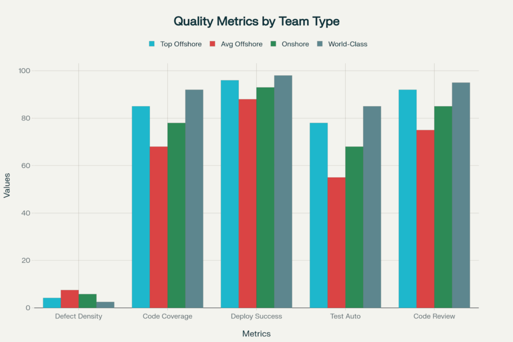 Code review coverage (92% vs. 85%), critical bug resolution time (6 hours vs. 10 hours onshore), and test automation coverage (78% vs. 68%) show that well-managed offshore teams can meet or surpass onshore quality standards.