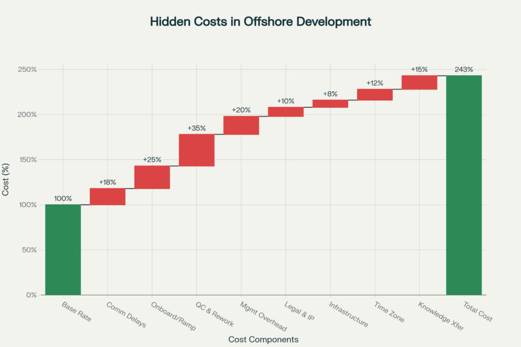 When accounting for communication delays (18%), onboarding (25%), quality rework (35%), management overhead (20%), legal protection (10%), infrastructure (8%), time zone coordination (12%), and knowledge transfer (15%), the total true costs, starting from a baseline hourly rate, reach 143-243% of advertised rates.