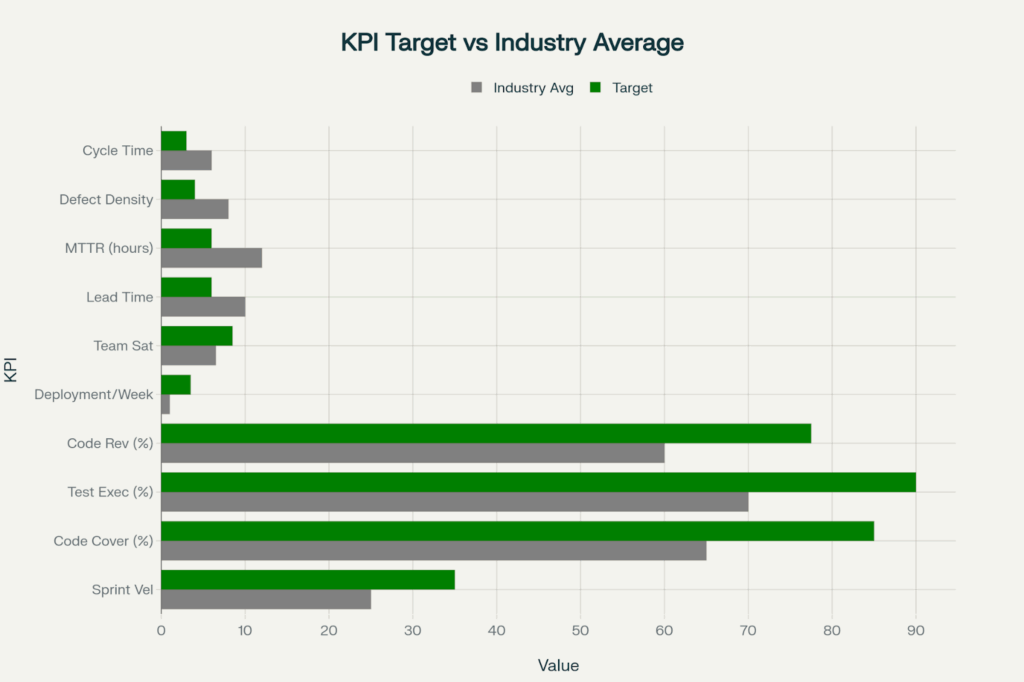 Operational velocity is measured by lead time (5-7 days vs. 10), deployment frequency (2-5 per week vs. 1), and mean time to resolution (4-8 hours vs. 12). Quality and sustainability are demonstrated by the test execution rate (85-95% vs 70%), code review effectiveness (70-85% vs 60%), and team satisfaction (8-9/10 vs 6.5/10).