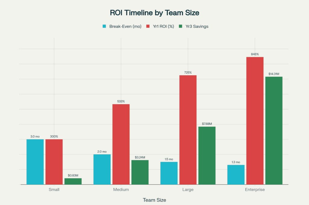 Enterprise teams (50+ developers) break even in 1.3 months, save $410K a month, and spend $550K on setup. ROI in Year 1: 846%. Savings over three years: $14.31 million.