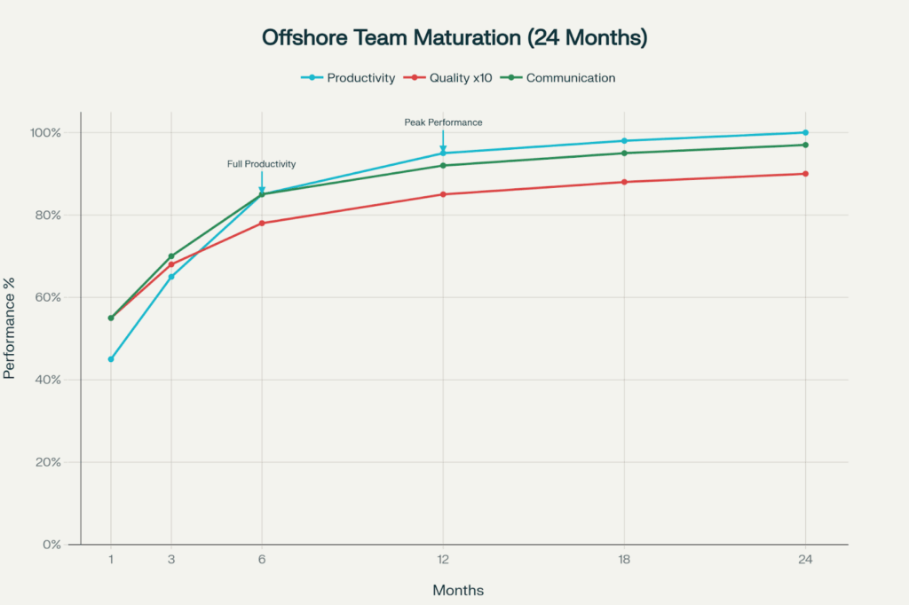 Productivity Maturation Curve for Offshore Teams (15-Person Team, 2024-2025)