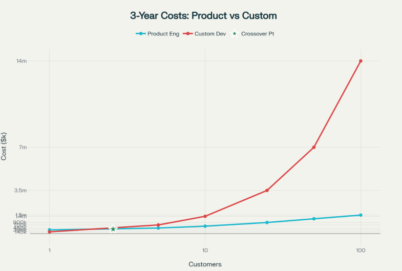 The cost math is straightforward: CDE is cheaper for just 1-2 customers ($140K vs $300K aprx over 3 years). Product Engineering wins at 3+ customers ($450K vs $700K for 5 customers) and delivers a 10x advantage at scale ($1.5M vs $14M for 100 customers).