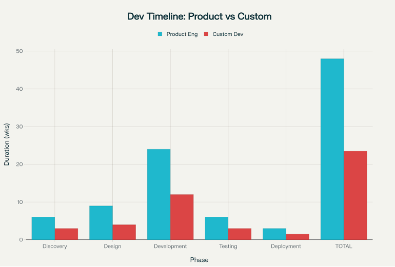 Comparison of development timeline: product engineering vs. custom development (weeks)