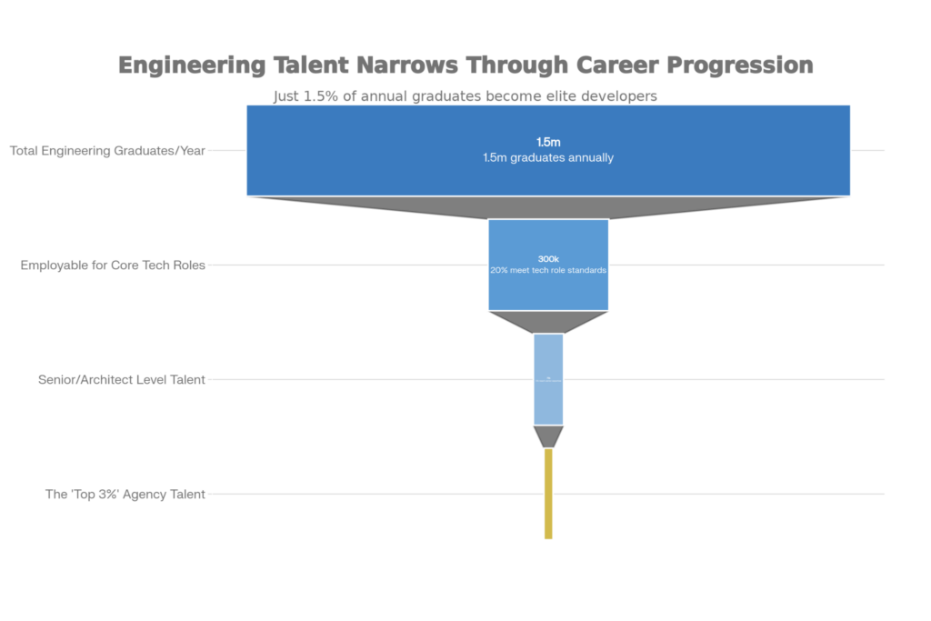 The “Top 3%” of companies don’t just pick up the best from the general population; they have a strict sifting process. Average agency hiring is based on knowledge of syntax (e.g., “Do you know React?”); highest-level partners hire based on engineering fundamentals (“Can you optimize this rendering cycle?”).