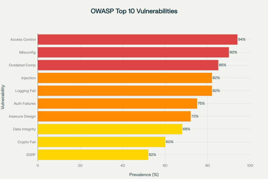 Access control is broken in 94% of web applications. 90% are affected by security misconfiguration. 85% contain vulnerable components. These are not corner cases, but the average.