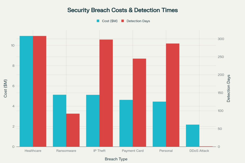 Healthcare records breaches cost on average $10.93 million with 308 days to detect and 89 days to contain—the longest across all breach types.