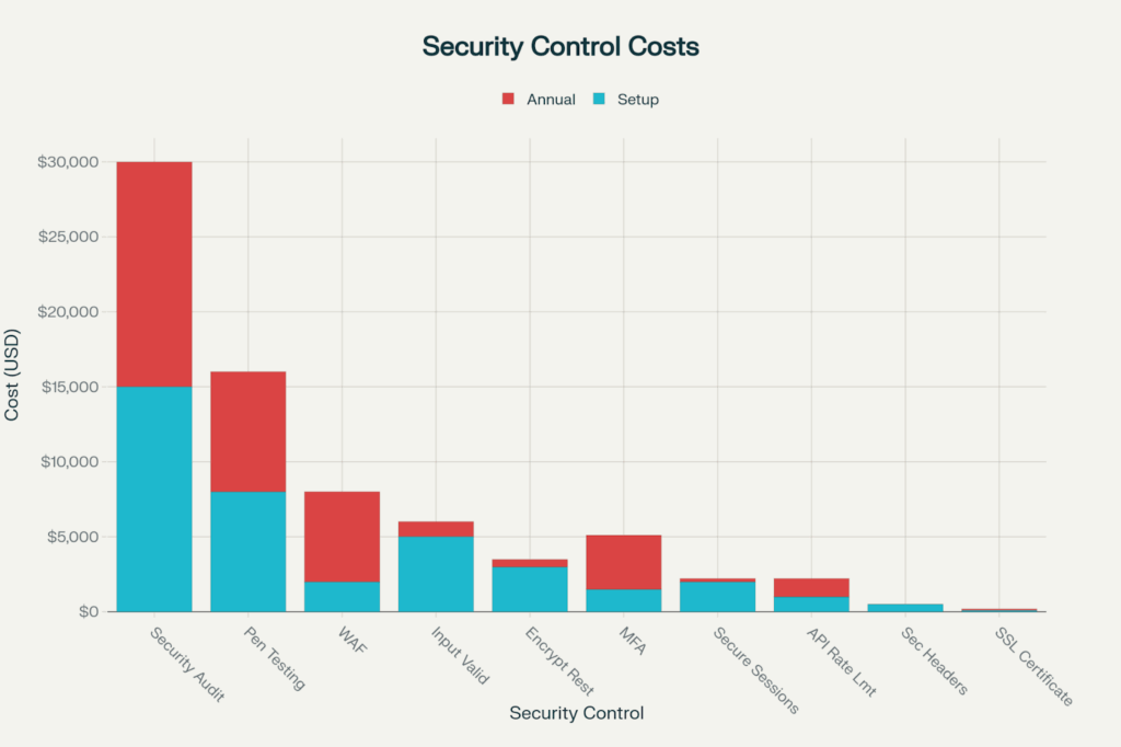 Complete first-year security budget for a medium-sized web application: $30,000-$80,000 (initial setup + yearly costs), which is a fraction of the costs of a typical breach.