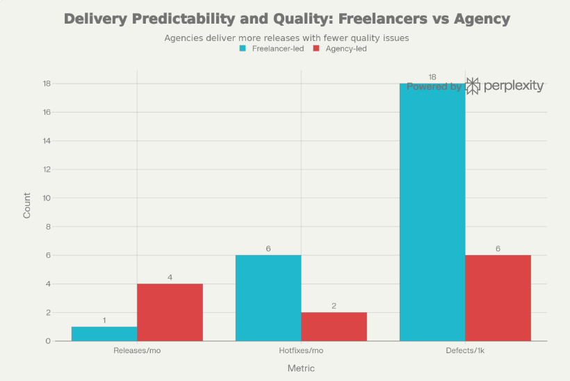 The difference in hourly rates between freelance and agency is often less than the cost of rework, coordination, and delayed releases. Defect prevention practices (shift-left testing + CI/CD + better requirements) eliminate waste and rework—precisely what a mature agency delivery model is designed to accomplish.